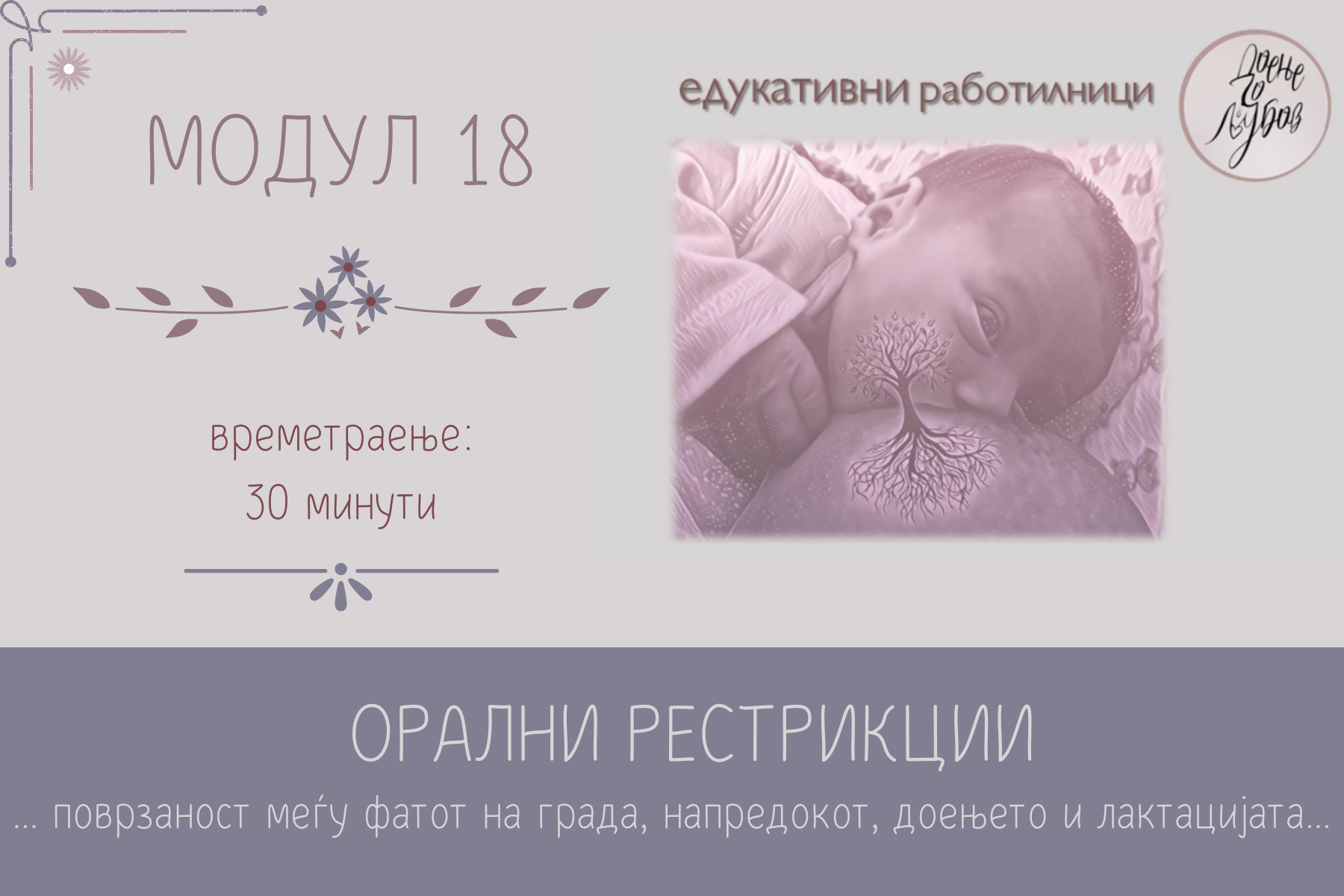 Овој модул ја објаснува проблематиката на оралните рестрикции преку практични примери на семејства кои имале искуство со овој предизвик. Опишано е нивното искуство, прикажани се подоите како изгледаат, напредокот во тежина, што тоа значело за лактацијата, каков проблем имала мајката за време на доење и сл.