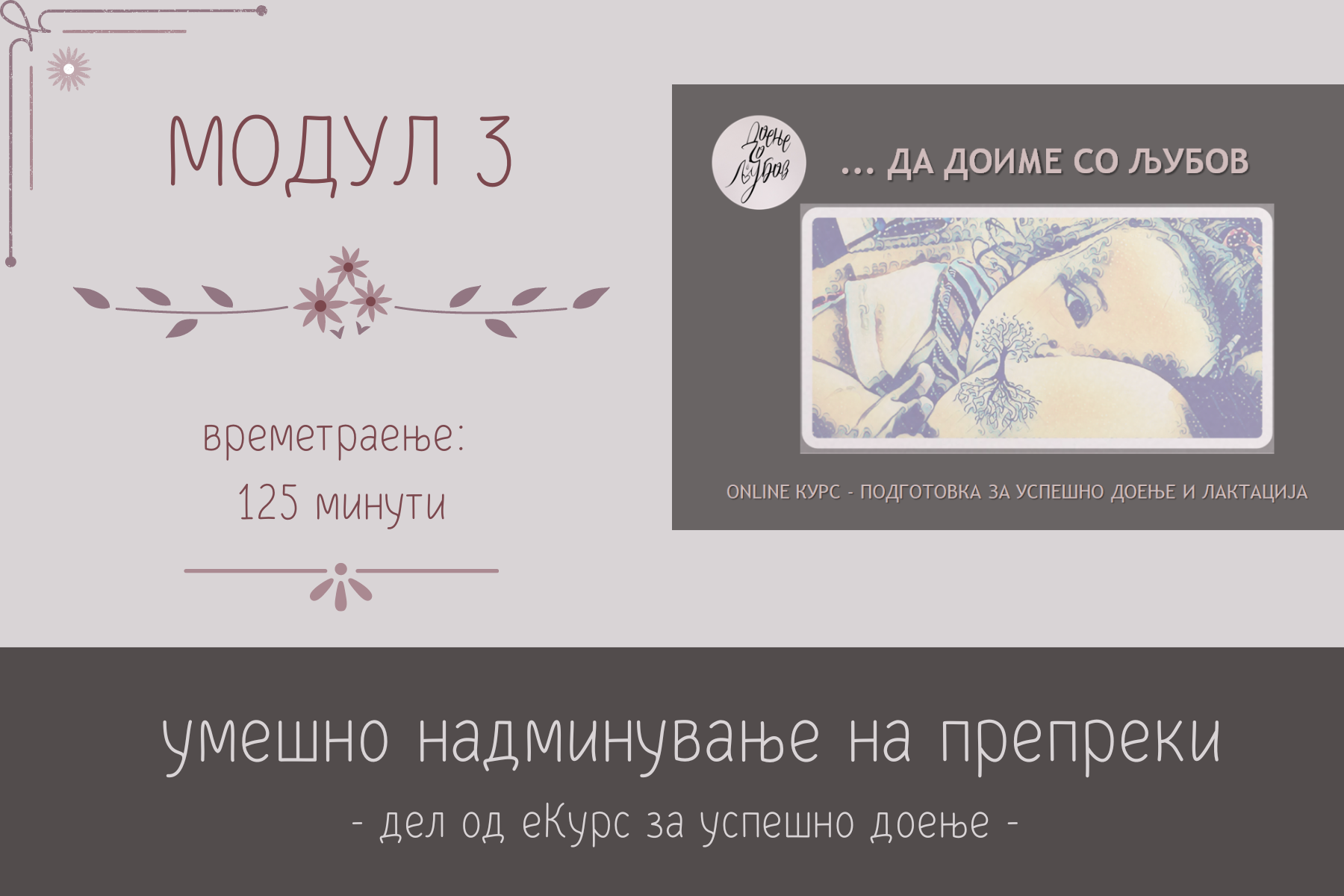 Модулот е наречен и „себеподдршка“ и има за цел да Ве запознае со сите потенцијални „сопки“ во првиот период со кои, верувале или не, многу жени се среќаваат во своето доенечко искуство. Разговараме за проблеми со фатот на града, затнати млечни канали, мастит, црвенила, рани на брадавиците и нивно третирање, рамни и вовлечени брадавици, отечени гради… Разговараме и за проблеми со хиперлактација и со хиполактација, примарен неуспех во воспоставување лактација, причини и справување. Разговараме и за препреки кои се резултат на фактор бебе – прематуритет, орални рестрикции, жолтица… Овој модул има за цел да Ви овозможи да си бидете самите себеси најголема поддршка, нудејќи Ви соодветна едукација, решенија и предлози за делување во повеќе потенцијални проблематични сценарија.